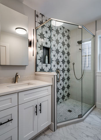 This 1931 budget Tudor was completely renovated to improve livability, increase usable space, and freshen the connection across all floors. Two dormers were constructed to the front of the house to improve street appeal and allow for a new stair in a more functional placement. This alteration enabled the kitchen to be opened up to the dining room, resulting in a more open and linked main floor. A back dormer allowed for a spacious new primary bedroom upstairs, which now contains a new bathroom and larger bedrooms. On the main level, changing the bathroom layout and removing a small closet increased flow and comfort. One of the original bedrooms was converted into a den, with direct entrance to a new terrace and backyard. The basement was completely renovated and now features a family room, full bathroom, laundry area, pantry, bedroom, and utility/storage space, transforming previously underutilized space into a practical and welcome aspect of the home.