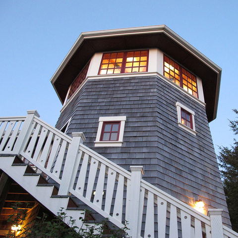 This novel vacation cabin in Cannon Beach, Oregon has been planned to be passed down from generation to generation. The tower is reminiscent of coastal lighthouses, provides a nearly 300º view, and provides excellent ventilation on hot summer nights. Custom details for storage and seating, such as the benches built in to the front porch railing, and a bottle display shelf circling the main room, create many special places inside this tiny cabin. With only two bedrooms, the main room has a built-in settle that will double as an extra bed when needed, in keeping with the owner’s desire for a small cozy charming vacation cabin.