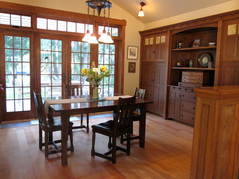 An addition to the main floor included a master bedroom, dining room, and a trellissed patio. The dining room is open to the living room, and has cathedral ceilings, a built-in hutch, and french doors with transom lights out to the patio.